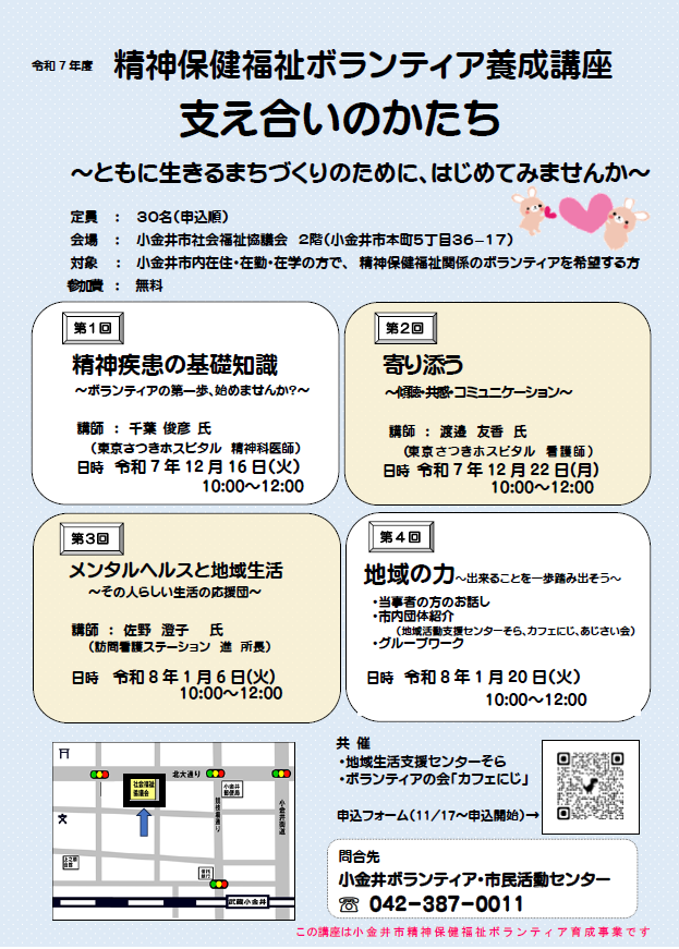 令和7年11月17日(月曜)から、以下の申込フォームで小金井ボランティア・市民活動センター(小金井市社会福祉協議会)へお申し込みください。