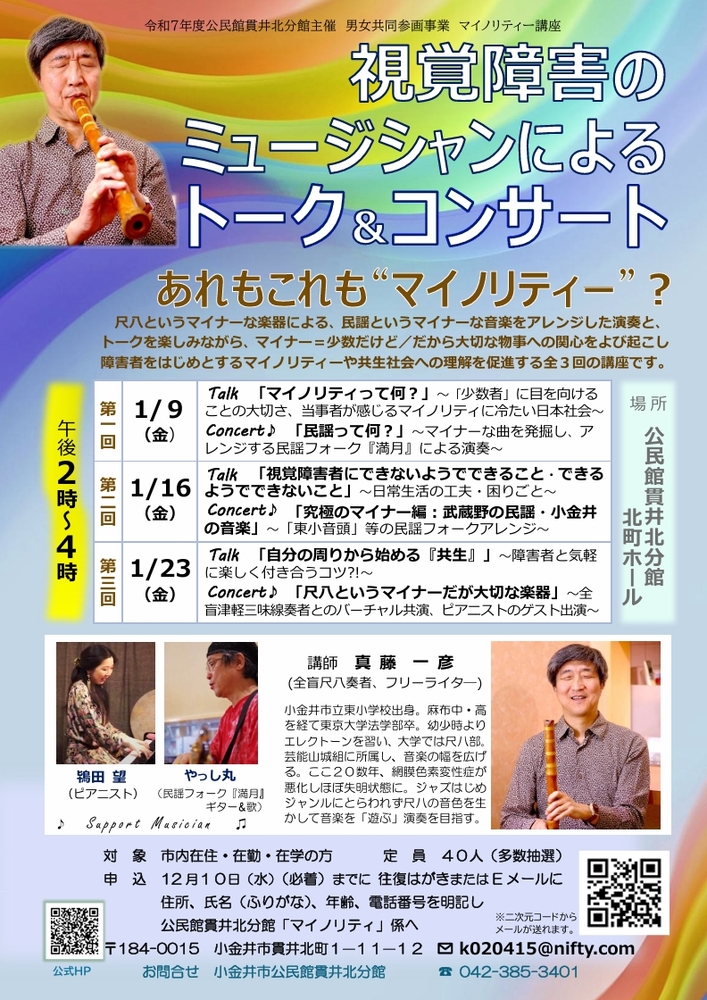 公民館貫井北分館 男女共同参画教育事業 マイノリティ講座 「視覚障害のミュージシャンによるトーク&コンサート―あれもこれもマイノリティ?―」を開催します