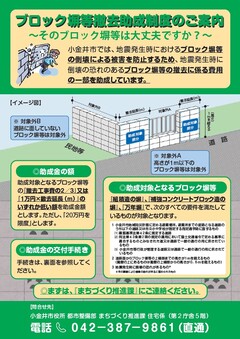小金井市では、災害に強いまちづくりの実現のため、一定の要件に該当するブロック塀等の撤去に要する費用の一部を助成します。助成を受けるには、ブロック塀等を撤去する前に事前相談及び交付申請を行い、市から交付決定を受ける必要があります。詳しくは、パンフレットをご覧いただき、お問い合わせください。