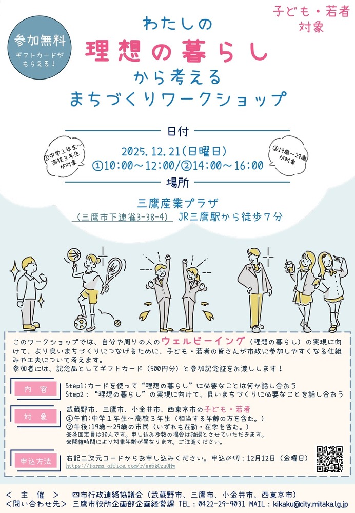 午前10時から正午 | ウェルビーイングカードを使って「理想の暮らし」に必要なことは何かを考えよう | 三鷹市、武蔵野市、小金井市、西東京市に在住・在勤・在学 | 中・高校生世代 | 各回30人 |